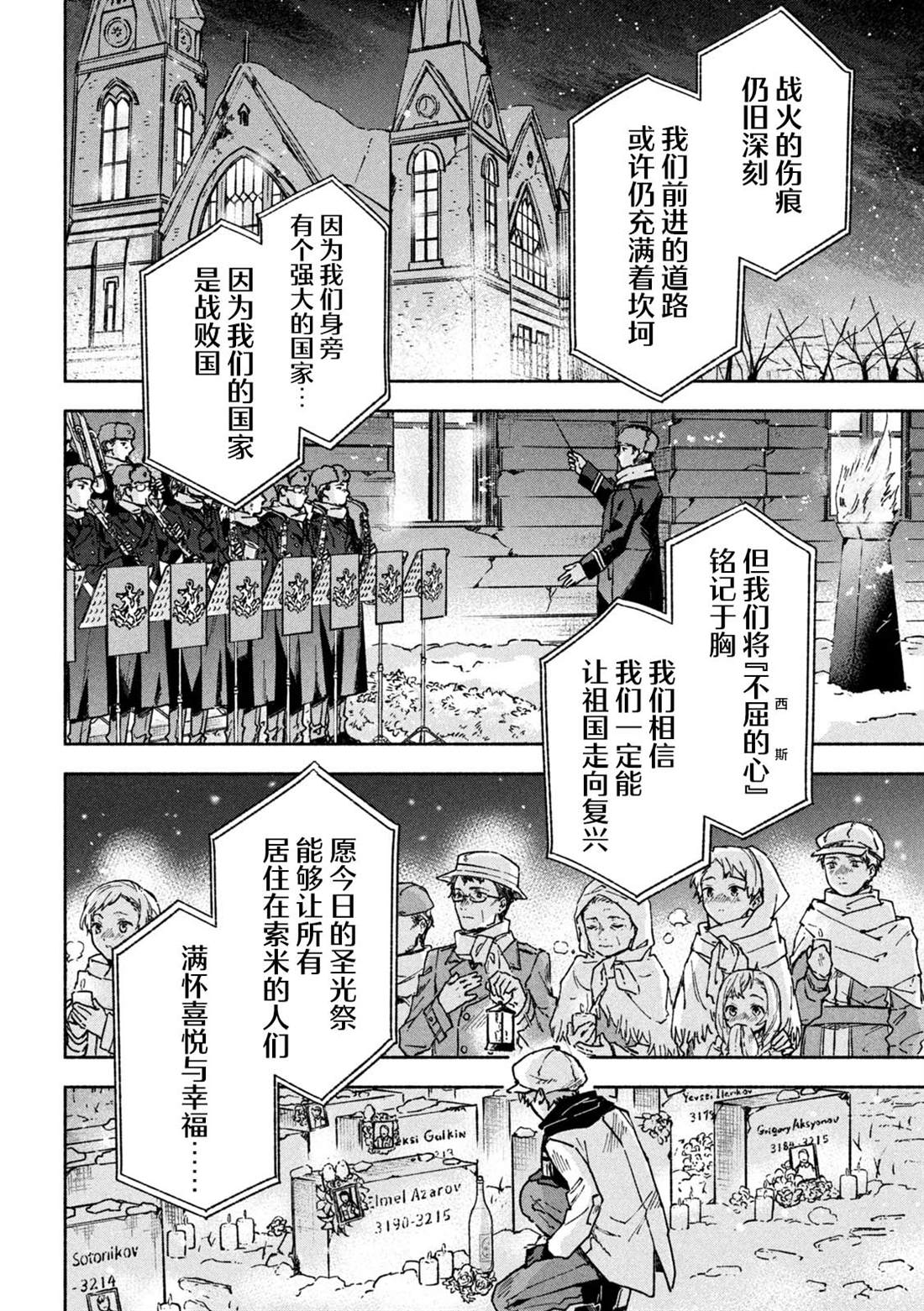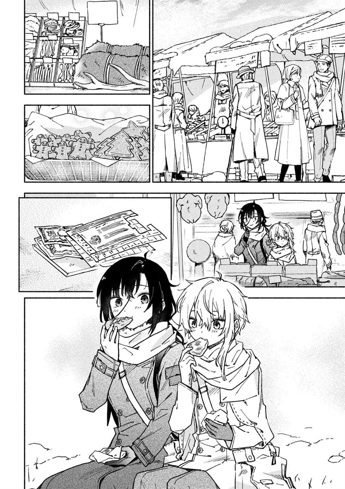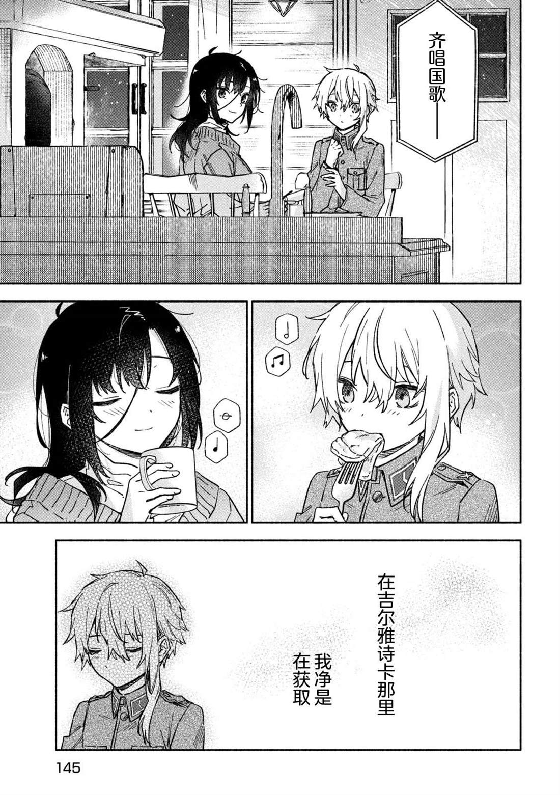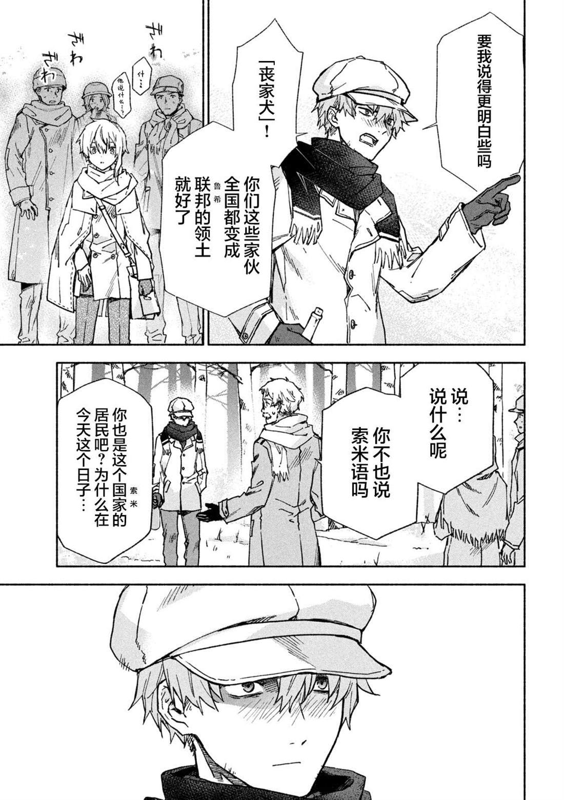 失去了去处的孤身一人的两人静静地依偎在一起等待著雪融化的日子——。战争结束4个月后的冬天始,在还残留著战争伤痕的森林中相遇的是只知道战场的原少年兵米耶利和被夺走故乡的退伍军人吉尔雅诗卡。在“战后”拼命活下去的2人坚强而虚幻的雪国慢生活!