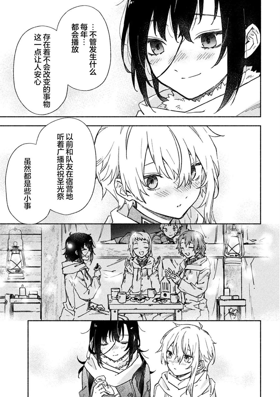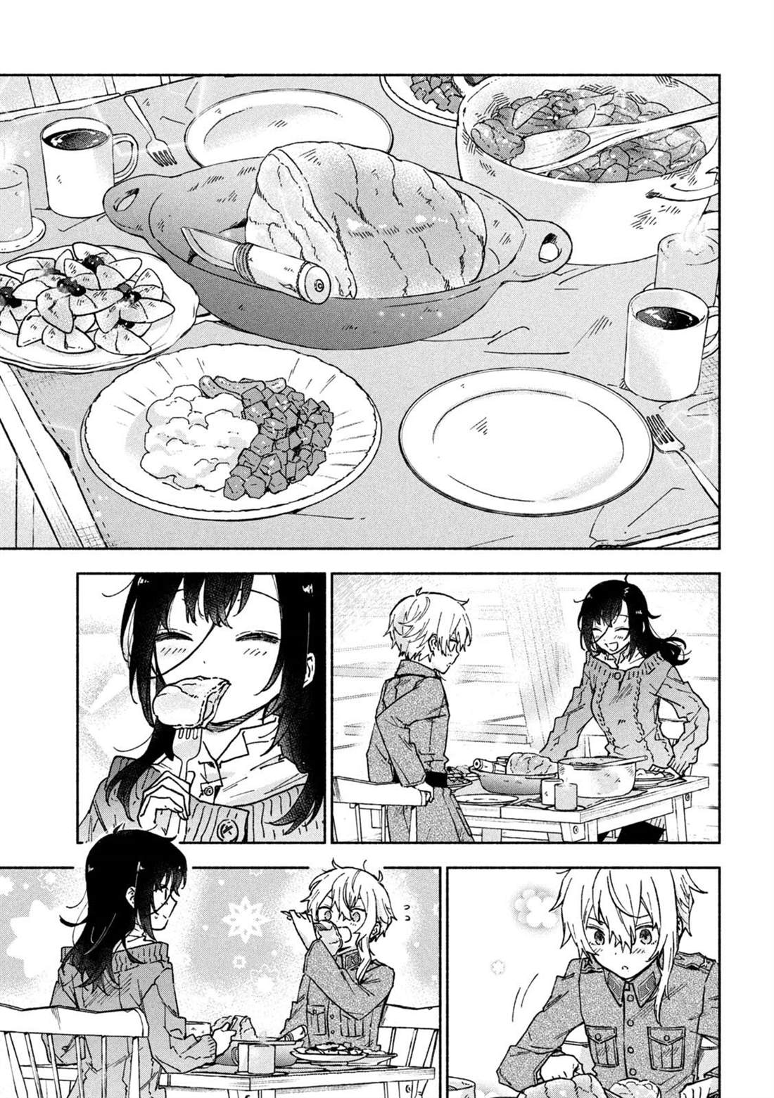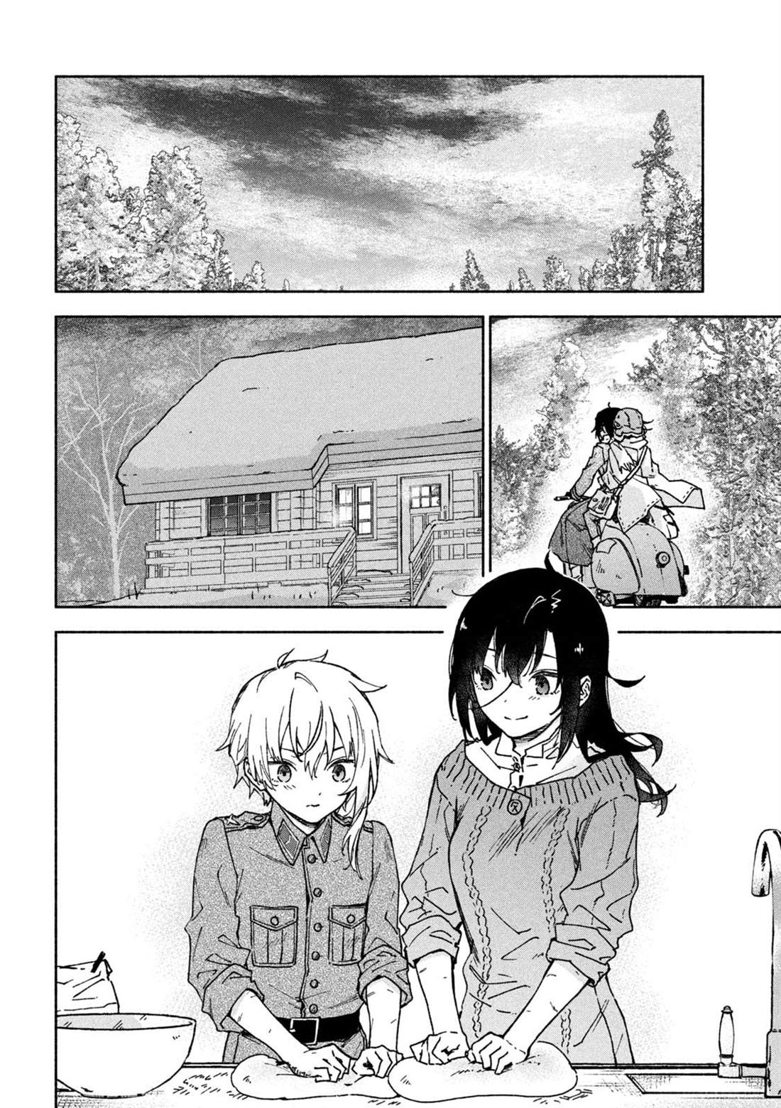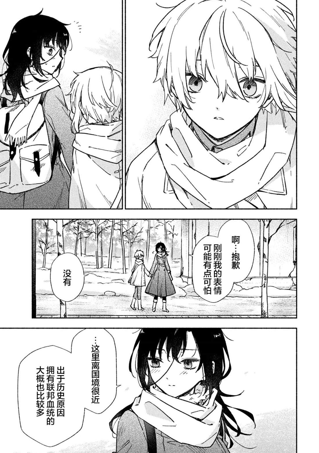 失去了去处的孤身一人的两人静静地依偎在一起等待著雪融化的日子——。战争结束4个月后的冬天始,在还残留著战争伤痕的森林中相遇的是只知道战场的原少年兵米耶利和被夺走故乡的退伍军人吉尔雅诗卡。在“战后”拼命活下去的2人坚强而虚幻的雪国慢生活!