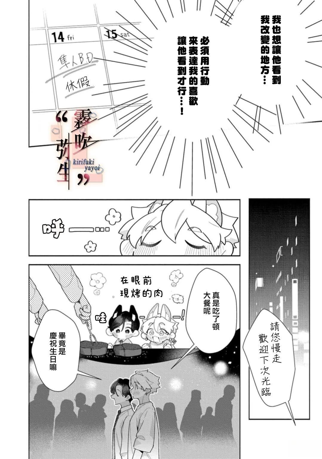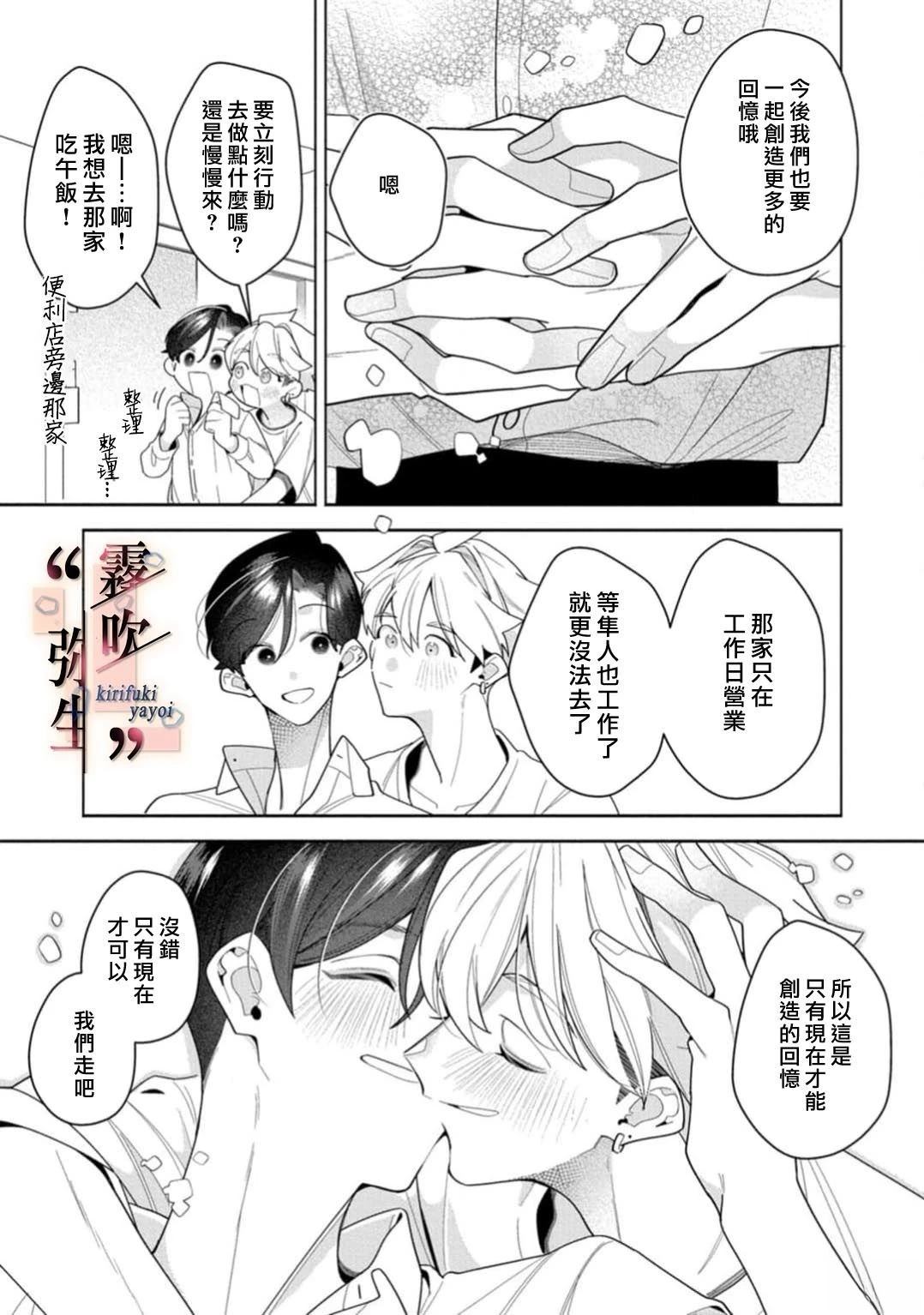 大崎泰央经营著一间小小的咖啡馆。 另一方面,三原辽辅却是满世界奔波的自由摄影师。 经过长期的交往,两人已经过上同居生活。由于辽辅经常不在家,同一屋檐下的两人却常常擦肩而过。 辽辅预定回国当天,泰央做了生日蛋糕等他回来。 但是辽辅却不打招呼就推迟了回国计划,连自己的生日也忘得一干二净。 数天后,泰央迎[]迎接了1个月没有回家的辽辅,不仅没怎么生气,还帮辽辅洗了头发。 两个人过著无需言语却充满爱意的日子。 「小心别陷入危险的境地哦。因为你总是无论再怎么累都不会联系我」 ——一个探寻独属两人的羁绊形式与对未来的约定[-折叠]